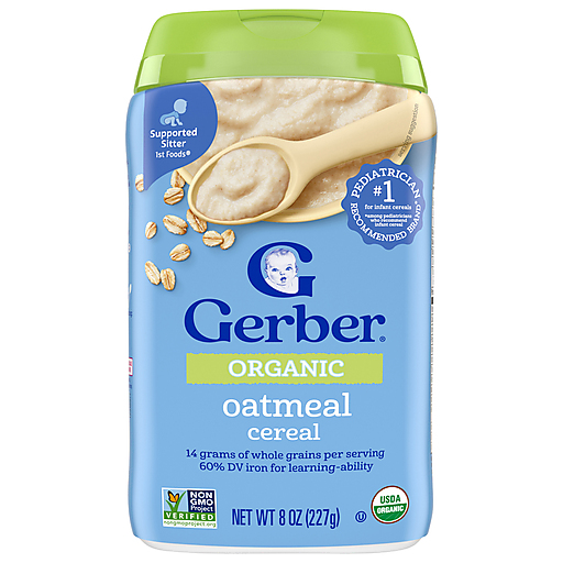 When your baby is ready to start solids, try Gerber 1st Foods Organic Single Grain Oatmeal Baby Cereal. This Gerber baby food stage 1 uses organic oatmeal for a single grain variety that helps your little one start with solids. USDA Certified Organic and Non-GMO Project Verified, this baby oatmeal cereal is made with no artificial colors or flavors. Gerber oatmeal contains iron to help support learning ability and just two servings of this infant oatmeal per day supply 90% of your baby's daily value of iron. Gerber oatmeal cereal also has vitamin C, vitamin E, zinc and 6 B vitamins for healthy growth and calcium to help build healthy bones and teeth. Single-grain infant cereals are an ideal first solid food to check for food sensitivities and help develop your baby's eating skills. Completely cooked and ready to serve, this Gerber First Foods organic oatmeal is easy to prepare for your supported sitter by adding breastmilk or infant formula. Store in a cool, dry place and use within 30 days of opening.